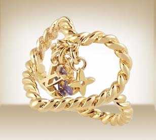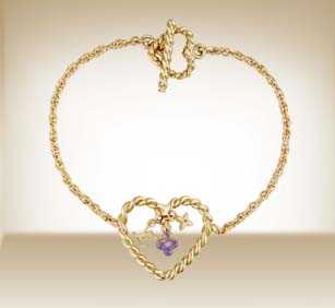 Los accesorios de esta línea están hechos en un fino metal antioxidante y antialérgico. Contienen charms y un lindo corazón hecho de piedras moradas que combinan perfectamente con el tono dorado de las joyas.