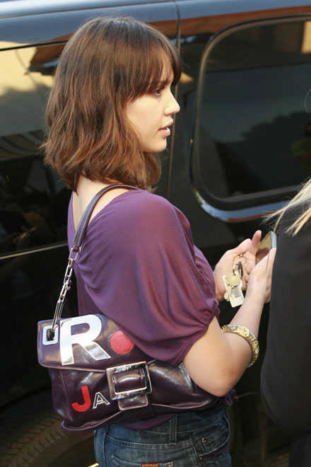 Por ejemplo, en la imágenes vemos a la famosa actriz Jessica Alba con su bolso Cut Up de color púrpura con las Iniciales de su nombre «J A» por Jessica Alba, grana cierto de esta chica ya que combina muy bien con su atuendo y, definitivamente, el morado está muy de moda.