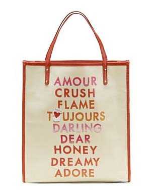 Kate Spade ha lanzado una línes de bolsos y accesorios que contienen palabras y colores perfectos para este día. Se trata de la línea Valentine´s Text y de Mon Cheri Amour. En la primera encontramos un bolso muy práctico, ideal como para ir a hacer las compras o para la playa. Además es un bolso muy combinable a un precio de $195.
