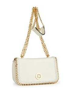 Una bandolera cargada de glamour, ideal para llevar con un vestido o traje formal, la mezcla de cuero en blanco (no solo en el asa, también en el ribete de la cartera) con la cadena dorada es muy retro.