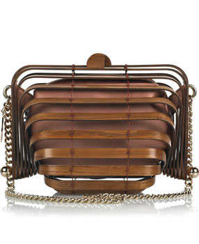 Comencemos echando un vistazo a este original modelo creado por Stella McCartney a partir de filamentos de madera y metal -pintado de marrón, para no desentonar- que en conjunto dan la apariencia de un divertido acordeón a la medida de la palma de nuestra mano. Además, tiene la ventaja de que el forro de satén que va en su interior es intercambiable, dándonos más posibilidades de combinarlo con otros looks: