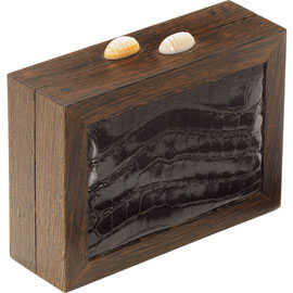 Y si quieren un cluth con status de pieza de colección, solo tienen que ver este magnífico bolso con bordes de madera y cobertura de piel de cocodrilo teñida de negro. Directo al museo de los accesorios más «fashion»: