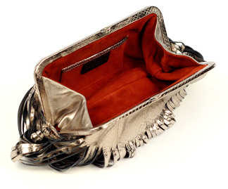 En esta foto Eva lleva un clutch, estos bolsitos son perfectos para una ocasión un poco más elegante no sólo porque se ven muy bien, sino por el tamaño y la practicidad, ¿se imaginan llegando a una gala con un maxi bolso? totalmente innecesario! Pero regresemos al clutch de Eva Longoria, este modelo está compuesto de un tejido dorado metálico que da la impresión de ser piel de serpiente y es simplemente encantador, cualquiera sentiría que está sobre al alformbra roja con un clutch así. Y si ven la foto de más abajo, se podrán dar cuenta de que el interior de esta cartera se ve bastante cómodo, por lo que se puede colocar el lápiza labial y una versión «mini» de tu perfume favorito sin ningún problema. La firma de este clutch es Katherine Kwei y el precio es 1,000 dólares.