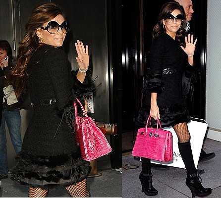 En la siguiente foto, vemos a Eva con uno de sus bolsos favoritos, así es, un Hérmes Birkin fucsia, lindo no? Dice que fue un regalo de boda y vaya regalo porque un bolso como éste está valorizado en 50,000 dólares, así es, bastante caro, pero recordemos que es un Hérmes y el más barato está 12,000 dólares. En fin, el tamaño de este bolso es perfecto para usarlo en cualquier momento del día y el color está totalmente de moda, lo único malo es que tenemos que saber con qué combinarlo.