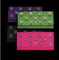 Estos modelos sobre me fascinan y a Wilhemina Slater de Ugly Betty también. Esta vez Prada los hace llegar en la misma gama de colores que los clutch pero en tonos mate. Las aplicaciones son muy similares, pues usa cristales y piedras junto al logotipo corto de Prada. Perfecto para trajes de gala.
