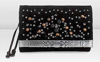 Por último tenemos el modelo Venus; esta opción de clutch en negro con aplicaciones de esferas de madera y cuentas de vidrio oscuro que suelen combinarse con exquisito detalle en la tapa del modelo con aplicaciones de brillantes que semejan a las escamas de un pez o serpiente.