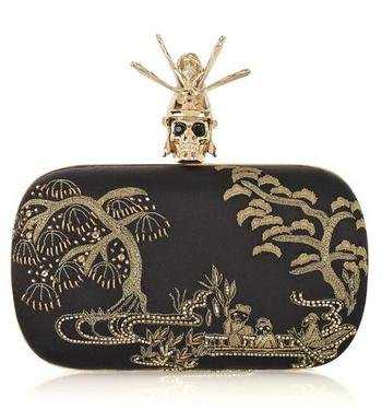 Los diseños orientales me parecen fabulosos, las sutiles flores y líneas doradas le dan vida a cualquier elemento, incluyendo los bolsos. Por ejemplo, este clutch de Alexander McQueen llamado Oriental Samurai. El bordado en satín refleja una tradicional escena japonesa. El otro clutch también me parece precioso, un poco más informal que el anterior, y que realmente llevaría a una fiesta o un cóctel, ¿tú no?.