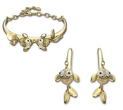 En Swarovski encontré un conjunto de brazalete, aretes y collar en oro con el diseño de pez koi, el clásico pez dorado oriental. Me parecen súper tiernos y divertidos, como para complementar un look informal.