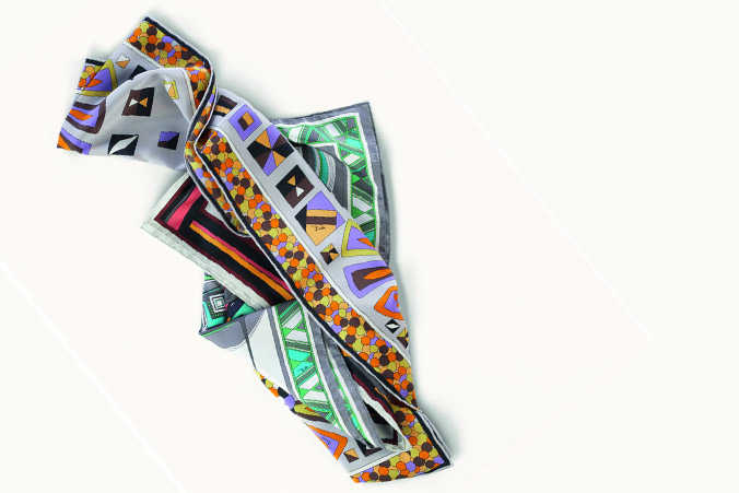 La seda es muy fina y elegante, por eso encontraremos más modelos de este material. Este fular de seda no tiene un accesorio, pero sí incluye estampados geométricos de diversos colores entre los que predominan el verde, el naranja y los tonos rosas. La marca es Pucci y el precio es 140 euros.