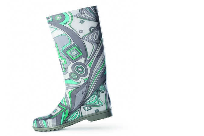 Los esstampados siempre son originales en botas o botines. Estas botas de agua cuentan con un estampado geométrico que usa los colores verde agua, gris y blanco. La marca es Emilio Pucci y el costo es 150 euros.