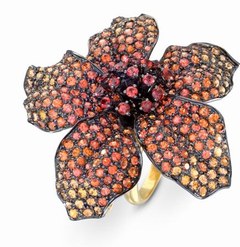 La textura que crea este joya de Lydia Courteille es espectacular puesto que los pétalos de la flor de hibisco están cubiertos de zafiros naranjas en distintas tonalidades, que llegan incluso al rojo y amarillo.