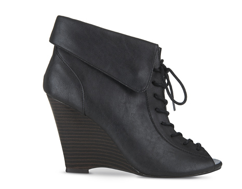 Ya que el color negro es altamente combinable, comenzaré por mostrarles un modelo de botín de cuero con plataforma, la punta abierta, pasadores y el detalle de un doblez en la parte superior a manera de cuello de camisa. Seguro que quedaría perfecto con una mini de jean o un vestido floreado corto. ¿Ustedes con qué lo combinarían?