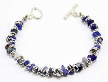 Las pulseras son una buena alternativa siempre y cuando el material sea noble como esta pulsera elaborada en hilo de plata con piedras azules, grises y aritos de plata, lo que le da ese look casual.
