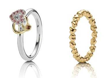 - Pandora no es sólo pulseras y charms, las colecciones de anillos y pendientes cada día ganan más seguidoras. Para el día de San Valentín del 2011, han lanzado estos románticos modelos de anillo que se pueden llevar solos o combinados. En plata o en oro, con un corazón rodeado de circonitas rosas y un aro con el detalle de un rubí. O un fino aro en oro lleno de pequeños corazones.