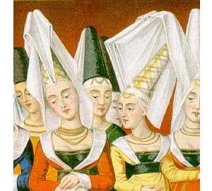 En la edad media, las mujeres usaban un sombrero bicornio (de dos puntas) del que colgaba una tela o manto que llegaba hasta los hombros. También era común el sombrero de cono que era atribuido a brujas y hechiceras.